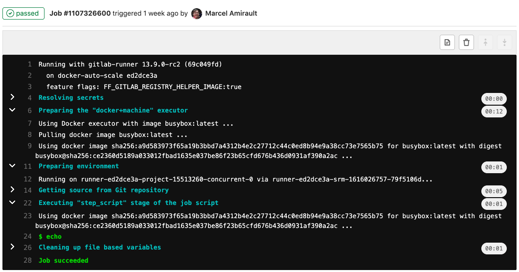 • Section start marker: \e[0Ksection_start:UNIX_TIMESTAMP:SECTION_NAME\r\e[0K + TEXT_OF_SECTION_HEADER