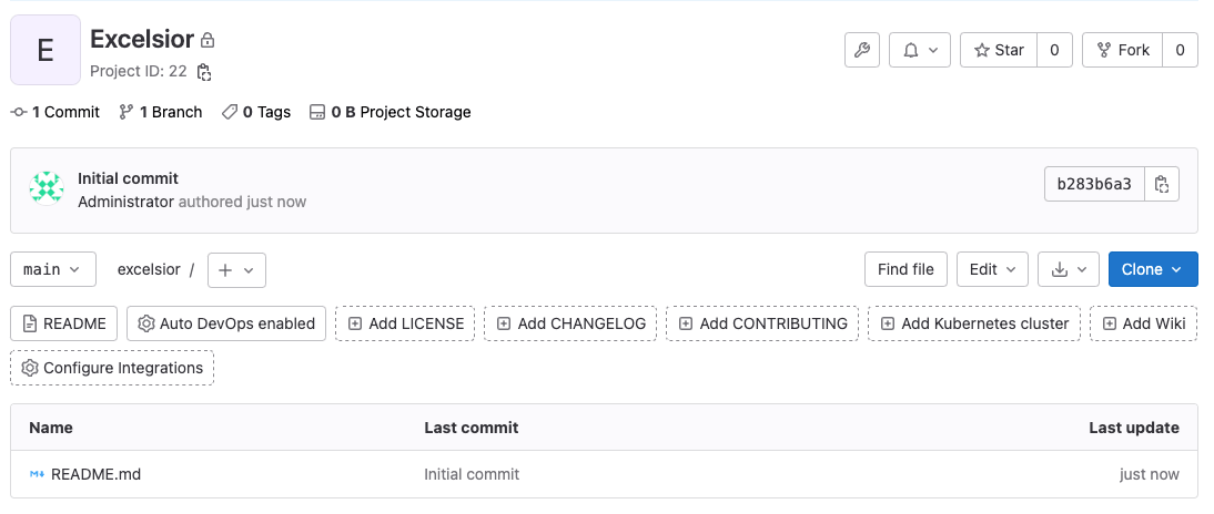 GitLab creates the excelsior project for you, and redirects you to its homepage. It should look like this: